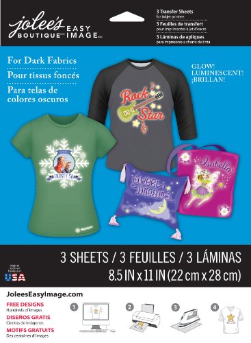 Create your own glowing designs for t-shirts, sweatshirts, tote bags and more with Jolee's Boutique Easy Image Iron-on Glow in the Dark Transfer Paper for dark fabrics. It's simple: choose from tons of images in JoleesEasyImage.com gallery or create your own. Print out and then use a household iron to transfer your design to fabric. Fabric is hand or machine washable after transfer. Includes 3 sheets, each 8.5-inces-by-11-Inch.Feature