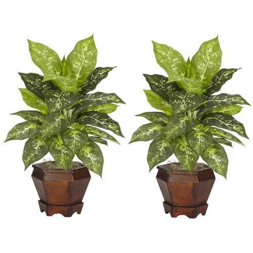 Nearly Natural 6712-VR-S2 Dieffenbachia with Wood Vase Decorative Silk Plant, Variegated, Set of 2