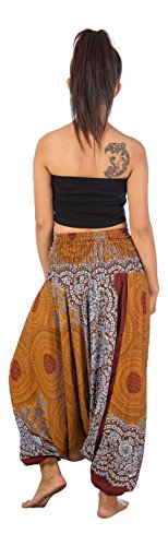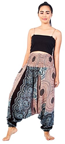 -. Feature : Made from soft and breathable rayon / One size fits most ; Loose fit jumpsuit and flowy pants / Comfortable smocked elastic waist ; Waist circumference unstretched (24 inch) and fully stretched (40 inch) ; Length 39 inches / Awesome for beach, festivals, holiday, relaxation, yoga ,nightwears or ordinary day / Elastic around the ankles