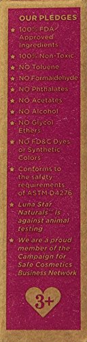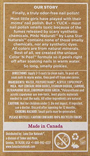 Water-based, odor-free color and peel mineral nail polish. Luna organics was founded by a mother of two girls with the aim of providing high quality, organic play items for children. Luna has developed a line of all natural kids' play makeup made entirely with natural, non-toxic, hypoallergenic materials. We wanted our daughters and their friends to have good choices in play makeup and noticed very few options so we decided to develop a line. Our products can be used for young children for dress up to tweens who are growing up.Feature