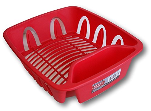 -. Feature : Essentials red dish draining rack measures 11.25'' x 13.75'' x 4.25'' / Flatware holder contains drain holes to prevent water from pooling / Eight perimeter cup holders / Ideal for students or new homeowners