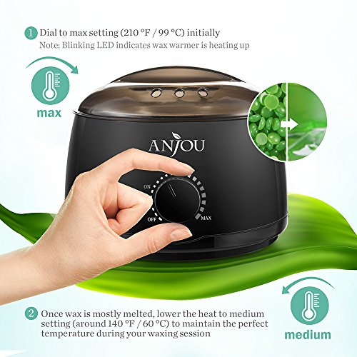 Skin Care Rule ? Test it on a small patch of skin first to make sure your skin is not overly sensitive to the wax. ? Test the wax temperature on waist before apply. ? Do not apply wax over cuts, burns, or wounds. ? Soothe your skin with an aloe lotion to calm redness and irritation after waxing session. What's in the Box: 1 x Anjou Wax Warmer (AJ-PCA010) 1 x Removable Wax Can 4 x 3.5 oz / 100 g Wax Bean 15 x Applicator Sticks 1 x User Guide