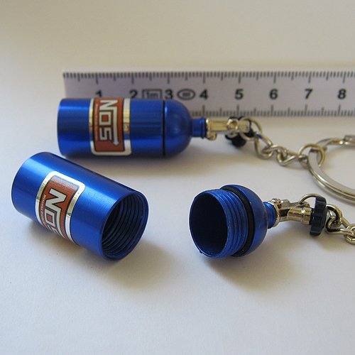 -. Brand : Boost Keychains -. Feature : Anodised Aluminum Body with Rubber O-Ring Seal / Very Small and Light / Storage area less than 35mm / Store Small Objects or just a Great Keychain / Ships from USA. Get it in a few days, not a few weeks from the China sellers. -. PackageQuantity : 1 -. ProductGroup : Automotive Parts and Accessories -. ProductTypeName : AUTO_ACCESSORY -. Title : NOS Bottle Keychain Keyring Nitrous Pill Stash Box - Ships from USA