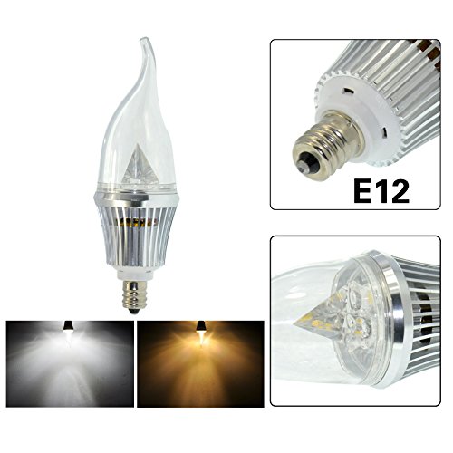 - Feature : Base Type:E12. IMPORTANT NOTE: ***READ BEFORE ORDERING*** Many crystal/hanging chandeliers, pilaster lighting and candelabra lighting fixtures which use the candle type flame tip light bulbs require the E12 base which is smaller in size than the E14 base. Please be sure to check which size you need for your light fixture prior to ordering. Thank you! / 3pcs Epistar Led; wide beam angle; low power consumption. / Safe and easy to install, no warm up time required, no IR and UV radiation / E12 candelabra base - fits chandeliers, scones and most night light fixtures. / Over 20,000 hours lifespan. Save your effort to replace bulbs on high ceiling