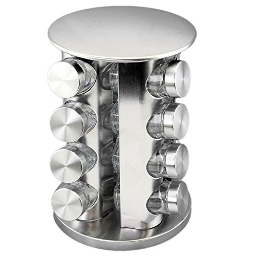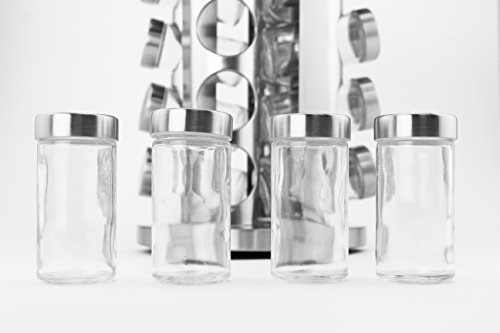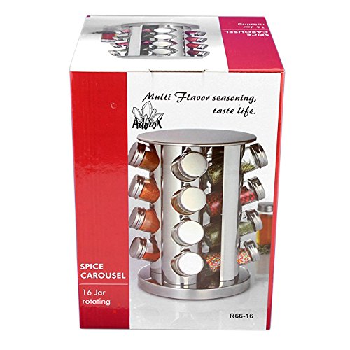 Studio : Adorox Publisher : Adorox Product Description This Set Includes 1 Round Spice Tower with 16 Empty Spice Jars. This Stainless Steel Spice Tower is functional, sleek, and modern to match with any decor while organizing your spice collection. Tower Measurements: Approximately 10.75" Tall x 5.25" Diameter. (27cm x 13.4cm). Jar Measurements: Approximately 3.5" Tall x 1.75" Diameter (9cm x 4.5cm). Jar Mouth Opening: 1.25" Diameter (3.2cm). Each glass jar has a removable 38mm 9-hole sifter fitment cap and a stainless steel lid. Offers a beautiful, unified look to your spices, herbs, and seasonings! 0
