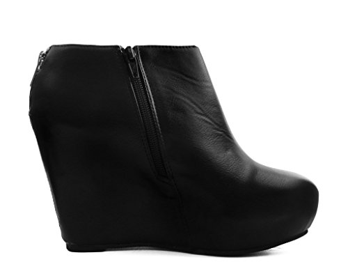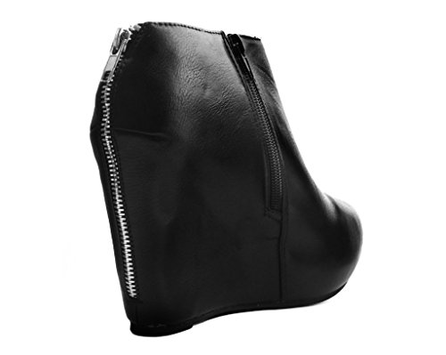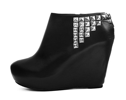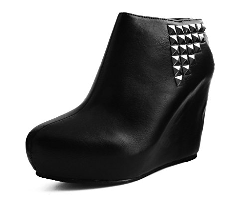 Binding : Apparel Product Description You're ready to make one hell of an entrance with these black wrapped wedge booties. Designed with a side zipper, a (non-functional) decorative heel zipper and pyramid studs you are ready to rock roll! -- TUK Plus styles include features such as elastic inserts on straps and legs to facilitate a flexible fit. The calves and ankles are cut larger (see details by style) and the ankle rear areas of the shoe last are extended to provide a comfortable fit for the plus size foot. 0