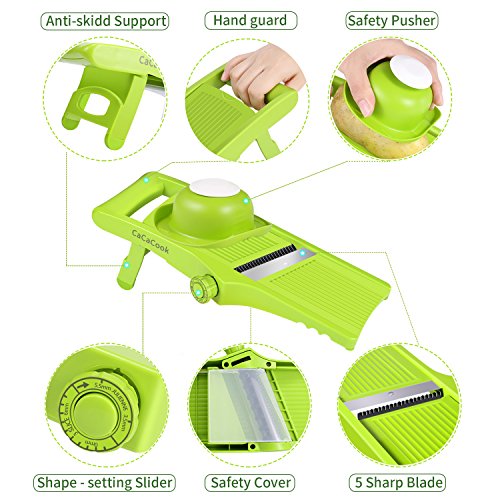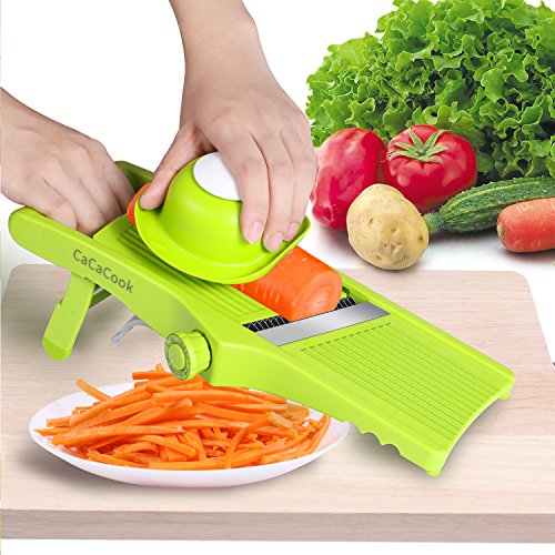 Studio : CaCaCook Publisher : CaCaCook Binding : Kitchen Product Description CaCaCook Mandoline Slicer CaCaCook professional Mandolin Slicer is a necessity in the kitchen. From sliced fruit and vegetable, waffle cut chips or varying thickness of French fries. NEWEST INOVATION WITH BUILD IN Rotating Adjustable Blades, which allows you to use the appropriate blade you need for many cut styles.