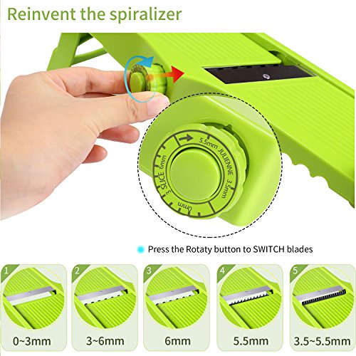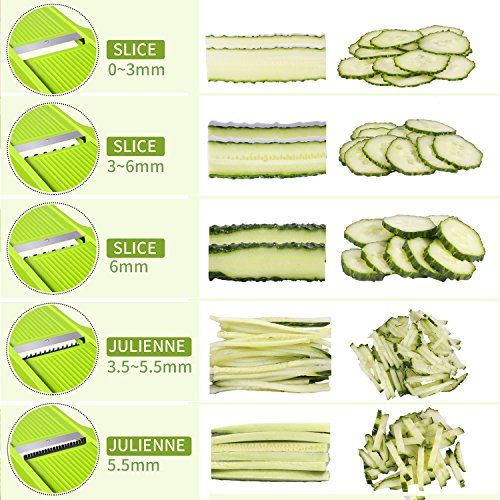 5 in 1 ultra sharp stainless steel blades and it is adjustable easily for all your slices or juliennes needs : 1 to 6 mm slicing plate for thin straight / medium/ thicker slices; 3.5 mm julienne blade for thin julienne stripes such as Carrots and Zucchini; 5.5 mm julienne blade for thick julienne stripes such as French Fries.