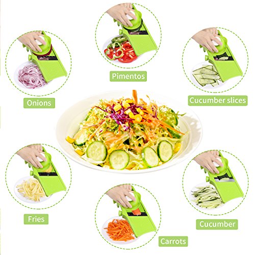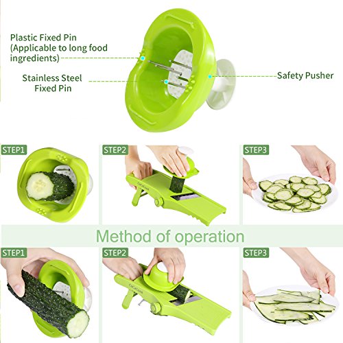 Features -? 100% BPA free, food-safe, durable reinforced ABS plastic and Stainless Steel. -? Ultra-sharp blades will slice your food effortlessly -? Fold away feet makes it easy to store -? Unused side of blade is hidden for safety -? Safety Pusher and Non slip rubber feet and slicing guard makes this mandoline slicer safe to use -? Easy to clean, simply rinse under running water after use, Dishwasher safe -? Never use a sponge to clean the mandolin slicer and don’t dry with a towel -? Measures: 13" x 5.6" x 6.2" Inches