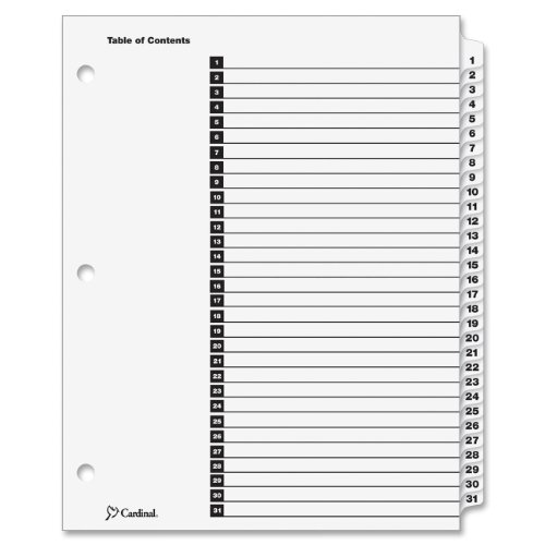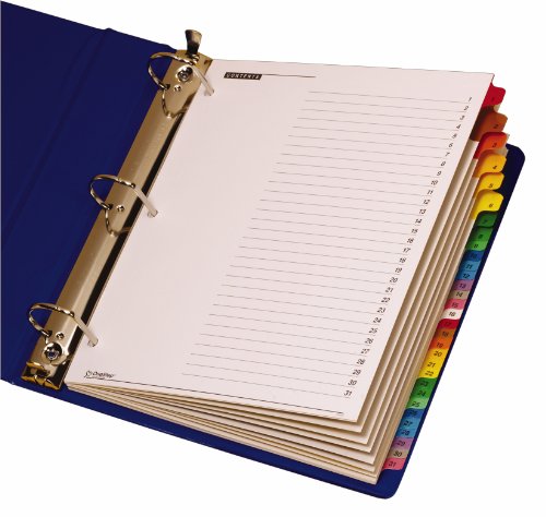 OneStep Index System instantly creates custom index sets by printing onto the included Table of Content sheets. Matching, preprinted tabs on the divider sheets can be used in either vertical or landscape formats. Multicolored tab sets have coordinating multicolor Table of Content sheets. Easy-to-use, free templates in your favorite software are available online. Tabs and ring edges are reinforced to withstand heavy use. Three-hole punched indexes are compatible with laser or inkjet printers, as well as standard typewriters. Tabs are numbered 1 to 31.