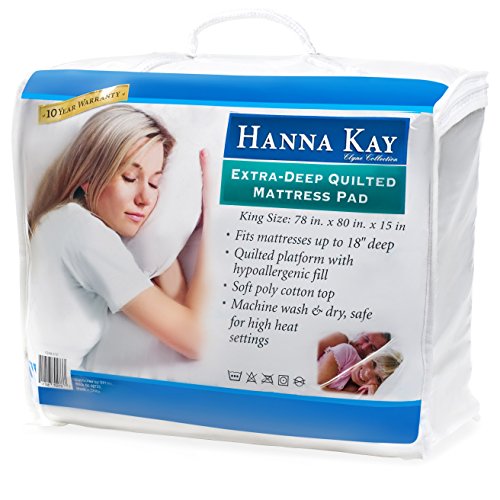-. Binding : Kitchen -. Brand : Hanna Kay -. Color : White -. EAN : 0791102591557 -. Feature : Knitted sides stretch for a perfect fit / Cushy, quilted platform with hypoallergenic fill / Breathable, Poly-Cotton Machine wash & dry / safe for high temperatures / 10 year warranty -. Model : COMIN16JU008188 -. MPN : COMIN16JU008188 -. PackageQuantity : 1 -. PartNumber : COMIN16JU008188 -. ProductGroup : Home -. ProductTypeName : HOME_BED_AND_BATH -. Size : king -. Title : Hypoallergenic Quilted Stretch-to-Fit Mattress Pad By Hanna Kay, 10 Year Warranty-Clyne Collection (King) -. UPC : 791102591557