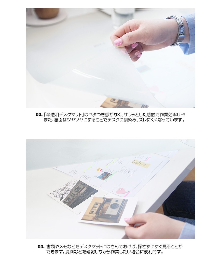 | 商品説明 | 「半透明デスクマット」はベタつき感がなく、サラッとした感触で作業効率UP! また、裏面はツヤツヤにすることでデスクに馴染み、ズレにくくなっています。 |
