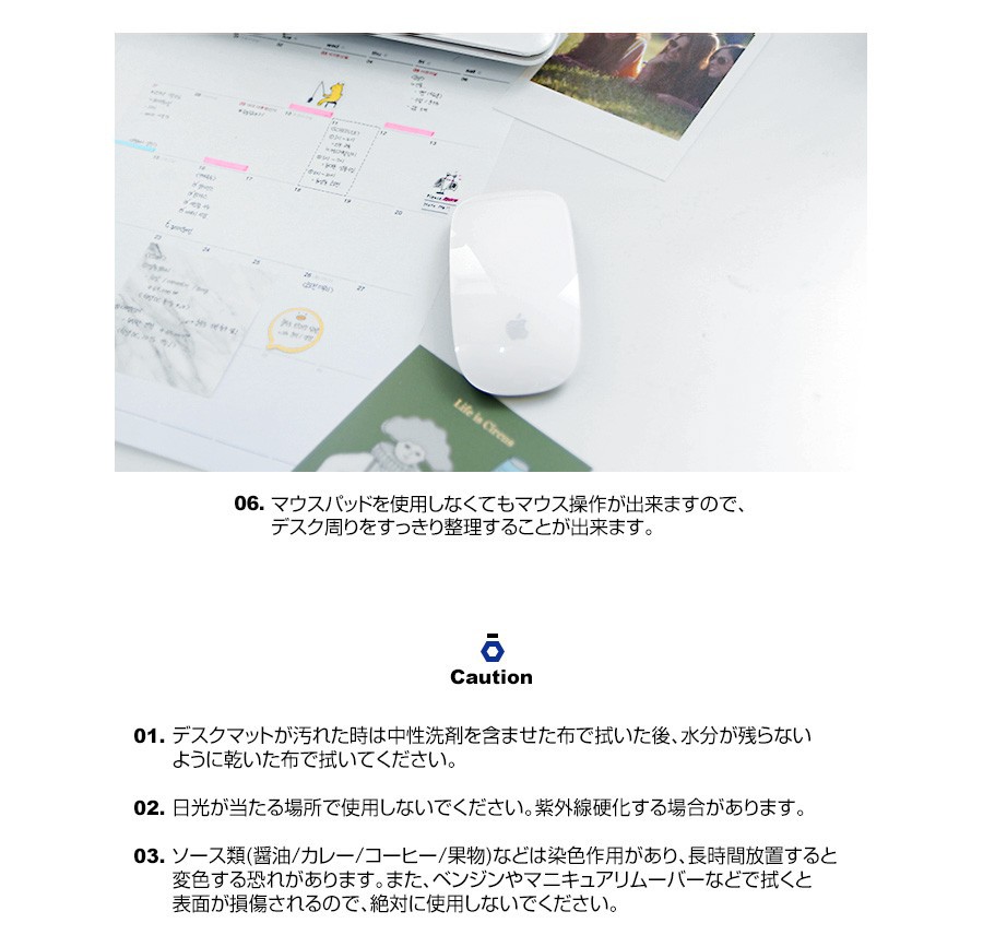 | 注意事項 | 01. デスクマットが汚れた時は中性洗剤を含ませた布で拭いた後、水分が残らない ように乾いた布で拭いてください。 02. 日光が当たる場所で使用しないでください。紫外線硬化する場合があります。 03. ソース類(醤油/カレー/コーヒー/果物)などは染色作用があり、長時間放置すると 変色する恐れがあります。また、ベンジンやマニキュアリムーバーなどで拭くと 表面が損傷されるので、絶対に使用しないでください。 04. 軟質PVC素材の特性上、商品が伸縮される場合があります。 机のデスクマットの用途以外は使用しないでください。 05. 家具、塩化ビニル系塗装(ラッカー塗装)、高級家具などに直接マットを敷くと テーブルの塗装がはがれる恐れがありますので、テーブルに布を敷いた後、 ご使用ください。 06. デスクマットの滑りによる食器などの損傷の可能性がありますので、デスクマットが 滑る場合には、滑り止めシール貼って使用してください。 07. 軟質PVC素材の特性上、購入後すぐに多少特有の匂いがする場合があります。 匂いは1?2日程度経過すると軽減されます。また、デスクマットには有害なものは 使用しておりません。 08. 耐熱温度60度であるため、熱いものやお湯などを零さないでください。 デスクマットが変形する可能性があります。高温のマグなど直接置かないように ご注意ください。 |