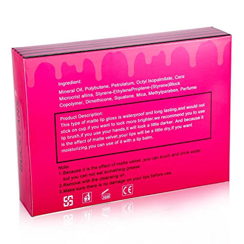 -. Feature : Effect of matte velvet,your lips will be a little dry,if you want moisturizing,use a lip balm before. / Don't compress lips after applied the gloss, or it will be sticky. Matte effect,long lasting and waterproof,easy to remove with lip cleansing oil. / Liquid lipstick, not 100% fills up, leave space when you put the brush in. / Light Strawberry taste lipstick,naturally healthy. if you don't like the taste, choosing careful. / PIGMENTED & MATTE VELVET EFFECTS - These shades are beautiful colors, pigmented and go on smoothly. it dries matte almost instantly without drying your lips out. They are such a good quality that are not hard to take off and dry matte with very pigmented colors to compliment all skin types.