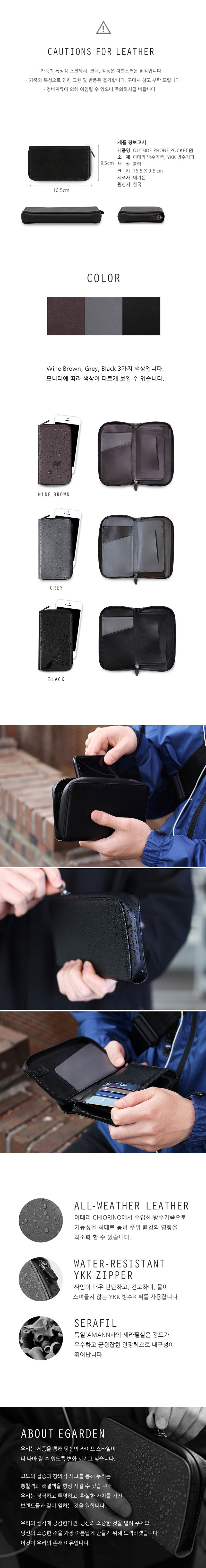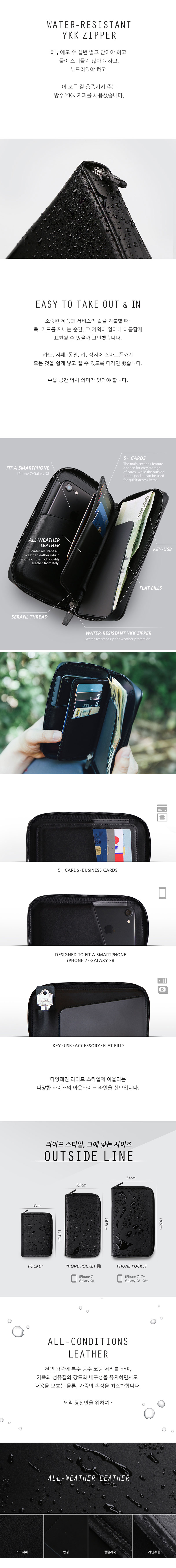 방수지퍼와 방수가죽으로 어떠한 상황에서도 보호되는 지갑.