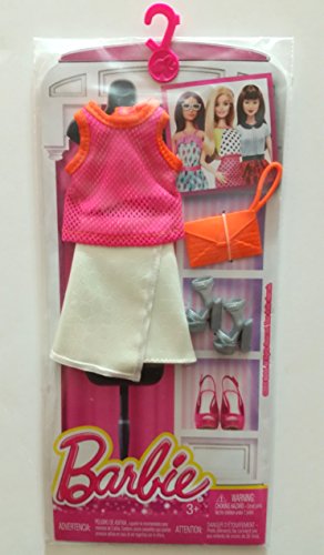 -. Title : Barbie Complete Fashion Pink Summer Netting over Midriff Top with White Wrap Around Look Skirt and Silver Strap Sandals and Coordinating Envelope Wrist Purse