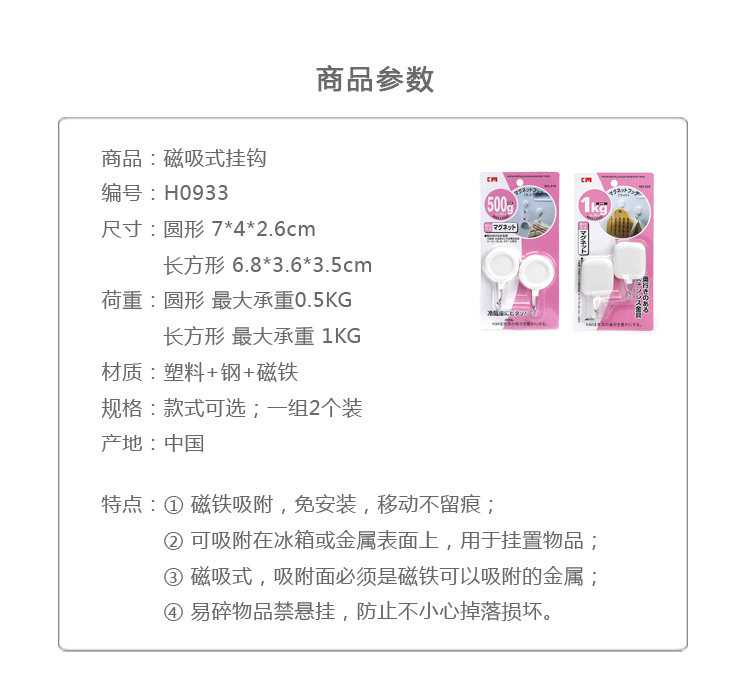 Magnetic hooksize:Round 7 * 4 * 2.6cmRectangular 6.8 * 3.6 * 3.5cmMaterial: plastic + steel + magnet