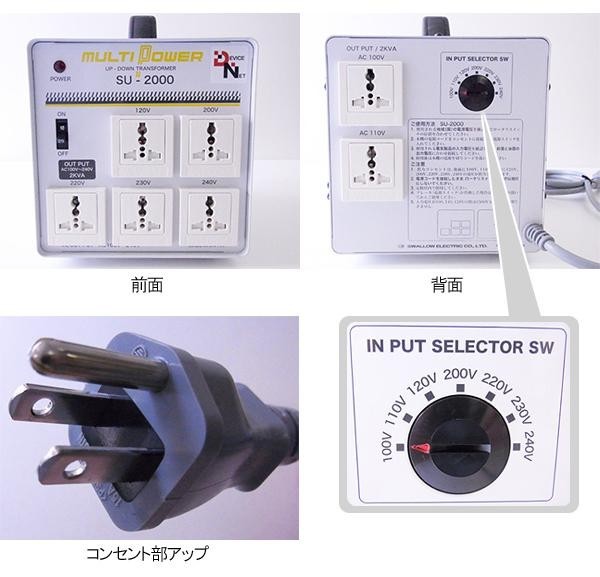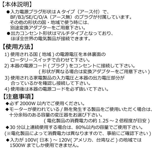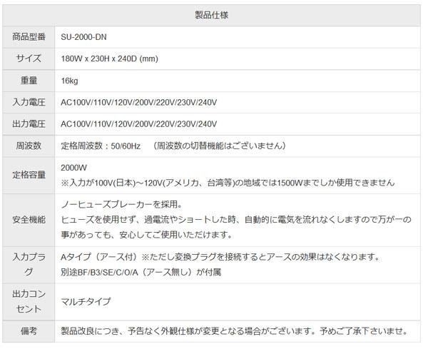 | 仕様 | 入出力電圧:AC100V/110V/120V/200V/220V/230V/240V 定格周波数:50/60Hz(周波数の切替機能はございません) 定格容量:2000W |