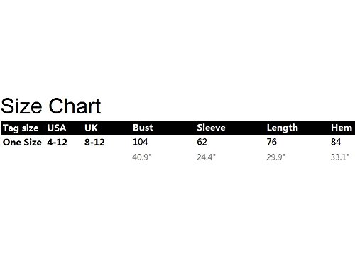 One Size=US 4-12 /UK 8-12 :---Bust :40.9"---Sleeve :24.4"---Length :29.9"---Hem :33.1" If you are not sure which size to select, you can inform your detailed size, such as bust, waist, hip size to us,we will help you make a correct decision.