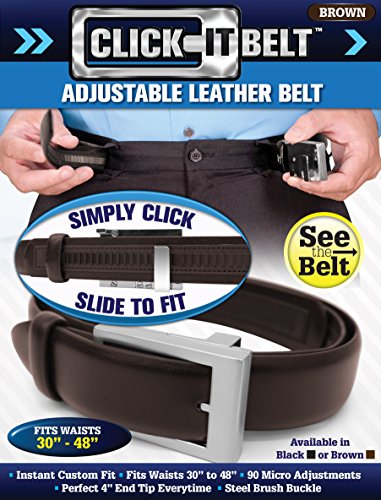 Studio : Emson Publisher : Emson Binding : Apparel Product Description As Seen on TV Click It Belt. Perfects for anyone with a size 28" - 48". This genuine adjustable leather belt and Steel brush buckle offer a timeless look Simply Click and slide to fit. Available in Black or Brown Color. 0