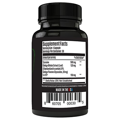 -. Feature : Helps Lower Stress and Anxiety by improving the efficiency of your brain power! / Safe & effective formula, which supports cognitive function, memory, and extreme focus / 1 Month Supply / 30 Capsules per Bottle - Made in a Strict GMP and FDA certified Lab / Pharmaceutical Grade ingredients such as Gingko Biloba, Tyrosine, and 5-HTP. / ALL NATURAL