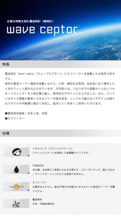 | 時刻を自動修正。電波時計「wave ceptor(ウェーブセプター)」にタフソーラーを搭載した女性用3針モデルです。シンプルで癖のないデザインは様々なスタイルや年齢層に幅広く対応し、飽きにくく末永くご使用いただけます。 |