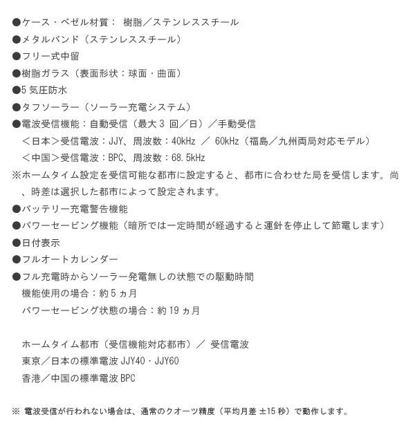 | 仕様 | 適応サイズ(腕まわり):12.5~18cm 使用電池:ソーラー充電電池(内蔵) 電池寿命:約7~10年 |