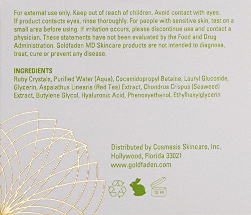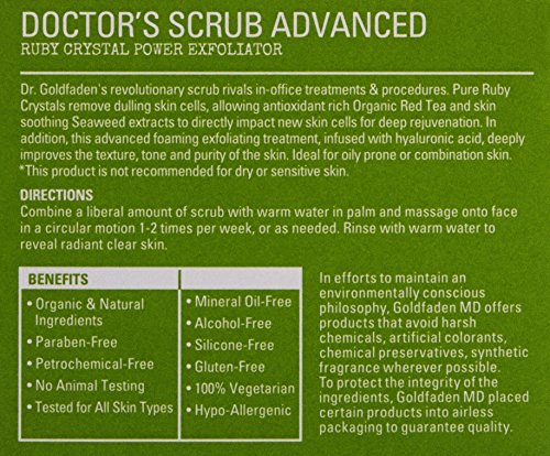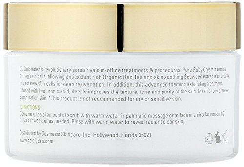 Dr. Goldfaden's revolutionary exfoliating treatment rivals in-office microdermabrasion treatments and procedures. 100% pure ruby crystals remove dulling skin cells, allowing antioxidant rich organic red tea and skin soothing seaweed extracts to directly impact new skin cells for deep rejuvenation. Infused with hyaluronic acid, this advanced foaming exfoliating treatment deeply improves the texture, tone and purity of the skin. Ideal for oily prone or combination skin.