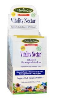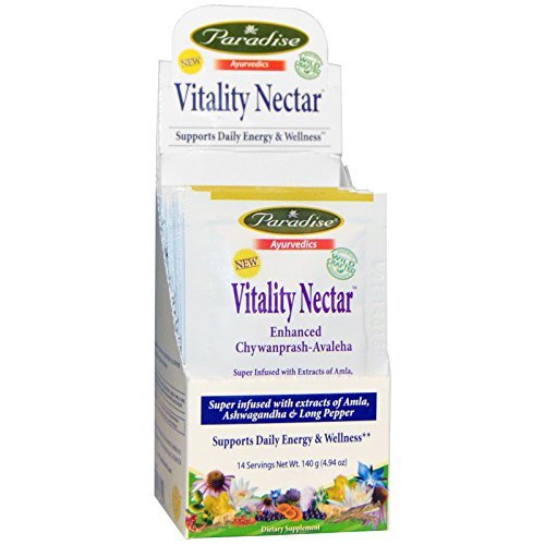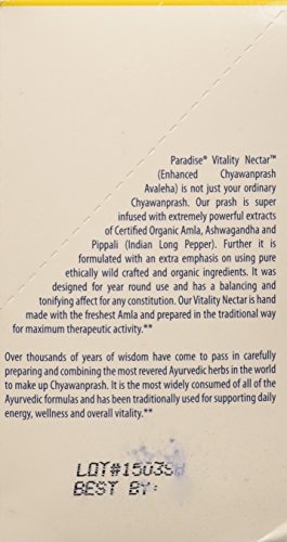 ReleaseDate : 2017-06-13 Studio : Chiropractors Buying Group Publisher : Chiropractors Buying Group Binding : Health and Beauty Product Description Paradise Herbs, Vitality Nectar, 10.58 Ounces. Paradise Vitality Nectar (Enhanced Chyawanprash Avaleha) is not just your ordinary Chyawanprash. Our prash is super infused with extremely powerful extracts of Certified Organic Amla, Ashwagandha and Pippali (Indian Long Pepper). Further it is formulated with an extra emphasis on using pure ethically wild crafted and organic ingredients. It was designed for year round use and has a balancing and toxifying affect for any constitution. Our Vitality Nectar is hand made with the freshest Amla and prepared in the traditional way for maximum therapeutic activity. 0