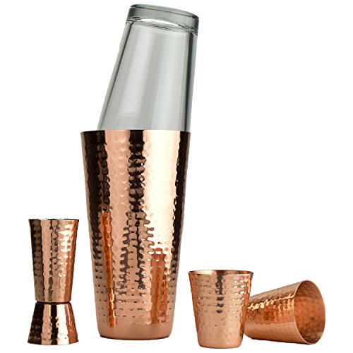 -. Brand : Prince of Scots -. Color : Copper -. Feature : Boston Style Shaker includes 28 Ounce Bottom Cup with 16 Ounce Mixing Glass. Hammered Stainless Steel with Copper Plate. / Double Sided Japanese Jigger constructed from hammered stainless steel with Copper Plate / Two Pure Copper Shot Glasses / Lacquer Coating to Prevent Tarnishing / Hand-wash, dry completely after washing with a cotton cloth. -. Label : Prince of Scots -. Manufacturer : Prince of Scots -. Model : CopperShakeSet -. MPN : CopperShakeSet -. PartNumber : CopperShakeSet -. ProductGroup : Kitchen -. ProductTypeName : KITCHEN -. Publisher : Prince of Scots -. Studio : Prince of Scots -. Title : Prince of Scots Hammered Boston Style Shaker Set ~ Copper