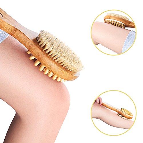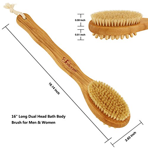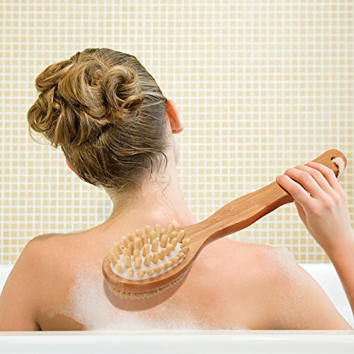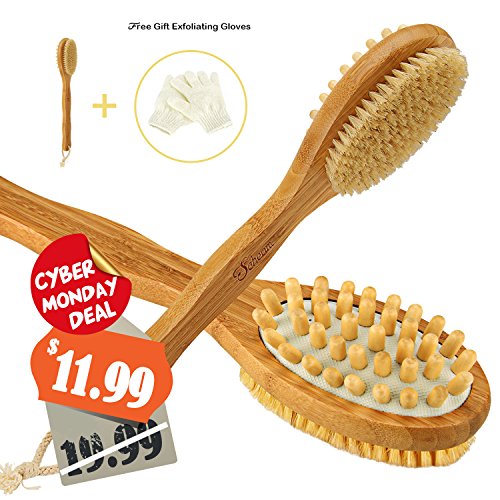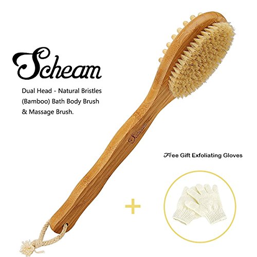 - REACH EVERYWHERE OF YOUR BODY MORE EASILY - With this 16" long handled bath body brush allows you to clean every spot on your body, it is a very versatile bamboo body brush,back brush scrubber, and a massage brush helps you to relieve stress, if you purchase it, you will get a pair of Free Scrubbing Exfoliating Gloves.