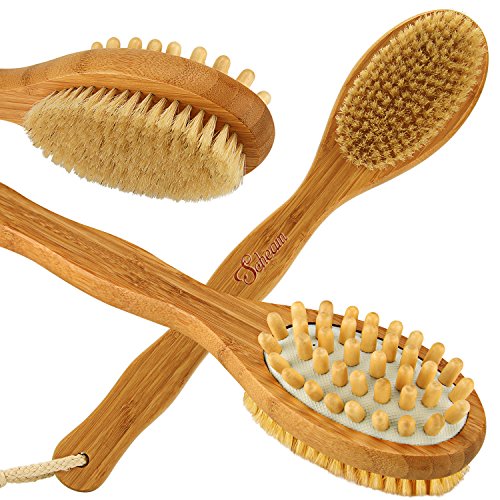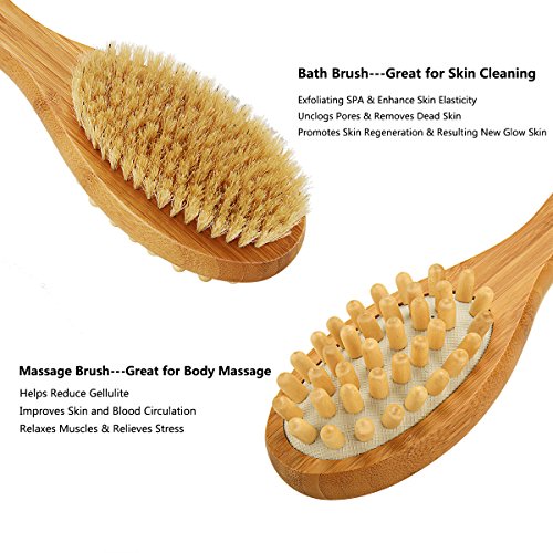 - SMOOTHER HEALTHIER SKIN & REDUCES CELLULITE: The brush is good for both dry and wet brushing, the brush helps you remove dead skin and exfoliate SPA then enhances your skin elasticity, last promotes your skin regeneration and result new glow skin, whiles the second side exfoliates massages and detoxifies your skin, helps to reduce acne and circulate blood circulation, helps to relaxes muscles & relieve stress.