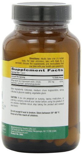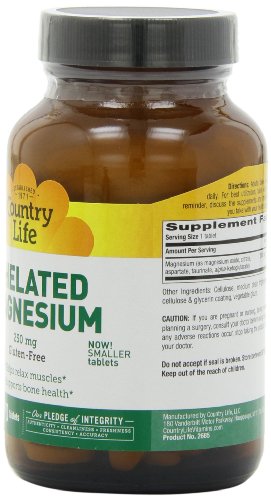 -. Binding : Health and Beauty -. Brand : Country Life -. IsAdultProduct : 0 -. Label : COUNTRY LIFE -. Manufacturer : COUNTRY LIFE -. PackageQuantity : 1 -. ProductGroup : Health and Beauty -. ProductTypeName : HEALTH_PERSONAL_CARE -. Publisher : COUNTRY LIFE -. Studio : COUNTRY LIFE -. Title : Country Life - Chelated Magnesium 250 mg.