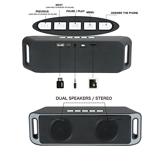Portable Wireless Bluetooth Speaker Waterproof Stereo Subwoofer TF USB FM Radio Built-in Mic Dual Speaker Bass Sound Speakers for Home,Outdoor,Golf, Beach and Shower Features: Bluetooth connectivity, TF card, U disk, FM radio, speakerphone, external MP3, computers and other audio products. Built-in 1800MA battery. Bluetooth: Jianrong Newest program Speaker Specifications: Dual speakers 40mm 4Ω3W x 2, with bass diaphragm, stereo Sensitivity: ≤1% SNR: ≥85db Rated power: 3W*2 Transmission distance: 10 meters Battery capacity: 1800 mA Rated voltage: DC 5V Bluetooth phone: Yes External LINE IN Speaker: Yes TF card function:Yes U disk function:Yes FM radio function:Yes Charging time: 3-5 hours Playing time: 3-8 hours Material: ABS plastic + iron mesh + silicone pad productsFeature