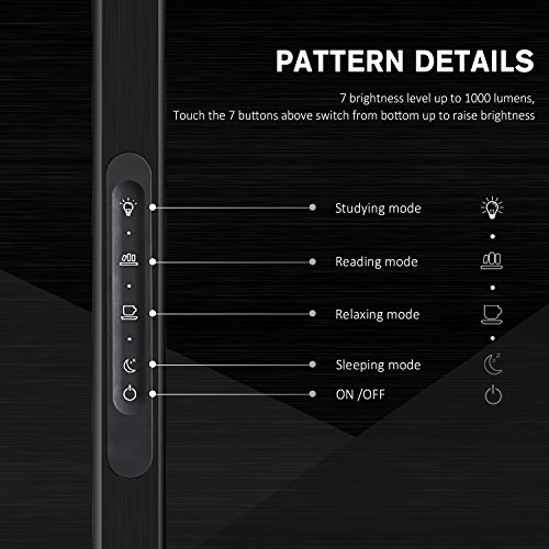 - DIMMABLE TOUCH CONTROL LAMP: 7 brightness levels up to 1000 lumens, 4 modes to choose from, Just one touch on the sensitive bar to adjust the brighteness. Memory fuction, get back to the mode you chose last time.