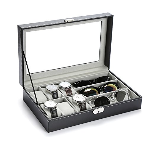 -. Title : PU Watch Jewelry Display Case,6 Watch boxes and 3 Pcs Sunglass Holder,Real Glass with Lock(Black)