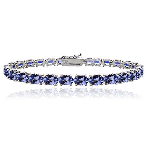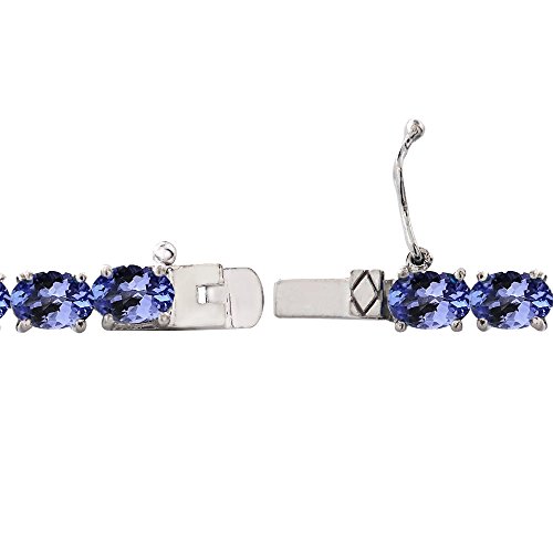 This gorgeous tennis bracelet features glistening 6x4mm oval genuine tanzanite gemstones. It is crafted entirely of sterling silver and is secured by a box tongue and safety latch.