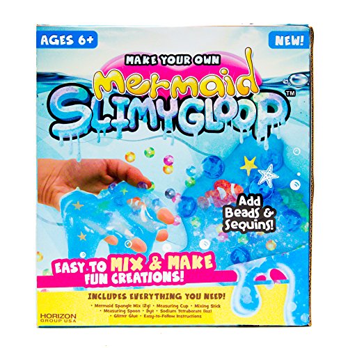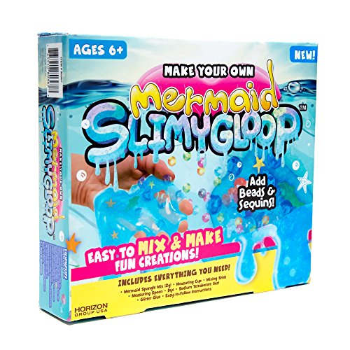 Feature Benefits, How It Works, What It Does, Unique Information Head under the sea for a mystical sensory experience with the Make Your Own Mermaid SLIMYGLOOP brand slime. Combine simple ingredients to create an ooey, gooey compound that’s fun to squish, squeeze, stretch and twist. Add clear beads to create a cool texture, sprinkle in spangles for an extra touch of sparkle, or fold in your own embellishments. Experiment with the ingredients to create slimier or sludger SLIMYGLOOP. Creating SLIMYGLOOP is a fun, hands-on way to introduce kids to chemistry, practice simple math and strengthen fine motor skills. Recommended for ages 6 years and up.Feature