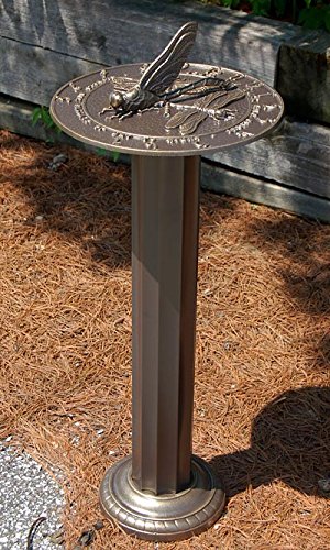 Studio : BestNest Publisher : BestNest Product Description Celebrate insects in a new way by adding this Whitehall Dragonfly Sundial and Roman Pedestal Kit to your landscaping. This lovely combination of an aluminum sundial and matching pedestal is sure to showcase your appreciation for the natural world. Hour demarcations from 5 AM to 7 PM create the outer band of the Whitehall Aluminum Dragonfly Sundial, followed by a phrase which reads "Flying jewel how quick your flight, Reflect the passage of day to night." Two raised dragonfly shapes rest inside the center of the piece to further the motif, and the gold tone on the raised sections of the bronze colored dial offer contrast. A three dimensional dragonfly rests in the center of the unit, and its raised wings create the gnomon. Attach the base of this dial to the included Whitehall Roman Sundial Pedestal, lending fantastic height to the unit. The fluted, center column of this stand brings a classic hint to any setting, enhanced by the braided detail on its 8" diameter base. The top platform handily accommodates the included sundial, and the bronze color scheme on each meshes with landscaping. Place this pedestal in stone or concrete using its included hardware, or use a bit of pipe (not included) to keep it stable in your soil. Crafted from aluminum, these pieces will remain lovely for many seasons outdoors. Keep time in your yard while adding a wetland hint with this Dragonfly Sundial and Roman Pedestal Kit. Assembly required. Made in the USA.