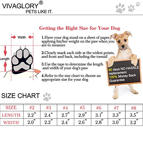 Why does your dog need the dog shoes? Dog paws are sensitive to hot pavements, cold snow, and salt-covered sidewalks. The dog shoes could keep your dog's delicate paws warm, clean and dry, and protect your dog's paws from potentially painful hot, cold, or salty surfaces. Why choose Vivaglory Dog Shoes? *Vivaglory Dog Shoes will act as a good partner for your dog; they can protect your dog's paws from hot pavement, icy surfaces and sharp objects *Made of breathable knitting material, keeps your dog's paw comfortable, clean and dry; rugged anti-slip sole provides superb traction your dog needs to stay safely mobile *Unique design with a wide split seam opening to easy put on and off; 2 long adjustable Velcro straps ensure secure fit, preventing slipping off; reflective straps also enhance your dog's visibility and safe at night *With 2 colors and 7 sizes, your dog will look fashionable How to get a right size for your dog? Step 1: Have your dog stand on a sheet of paper, applying his/her weight on the paw you are to measure Step 2: Clearly mark either side of your dog's paw at the widest points, measuring both length and width, accounting for toenails Step 3: Use the tape to determine the length and width of your dog's paw Step 4: Refer to the size chart to get an appropriate size for your dog KINDLY REMINDER: 1.If this is the first time for your dog to wear the dog shoes, please give him/her some practice to get used to wearing this dog shoes 2.Since the size of the front paws of your dog may differ from the rear paws, we provide 1 set of 2 shoes and 1 set of 4 shoes for your choice; please measure your dog's each paw individually and refer to our size chart to get an appropriate size for your dog 3.If there is any question, please contact Vivaglory Team via "Ask a question" to get a hassle-free return for a replacement or a refund 0 |