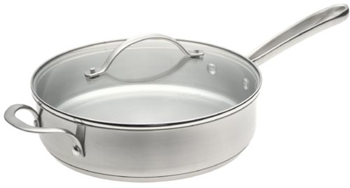 -. Feature : 3-quart, straight-sided saute pan; 10 inches in diameter, 2-1/4 inches deep / Mid-P.R.Iced alternative to Calphalon's top-grade stainless-steel line / Made of 18/10 stainless steel; aluminum bottom core conducts heat evenly / Stay-cool handles; domed glass lid; oven-safe to 450 degrees F / Dishwasher-safe; 10-year warranty against defects