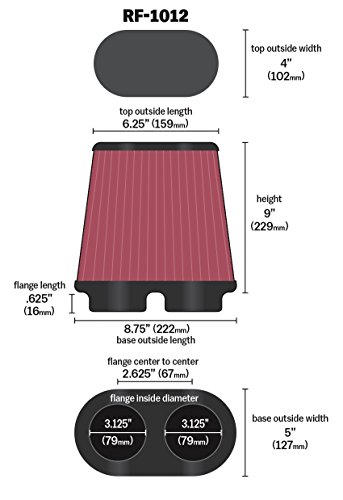 K&N RF-1012 Universal Clamp-On Air Filter: Oval Straight; 3.125 in (79 mm) Flange ID; 9 in (229 mm) Height; 8.75 in x 5 in (222 mm x 127 mm) Base; 6.25 in x 4 in (159 mm x 102 mm) Top