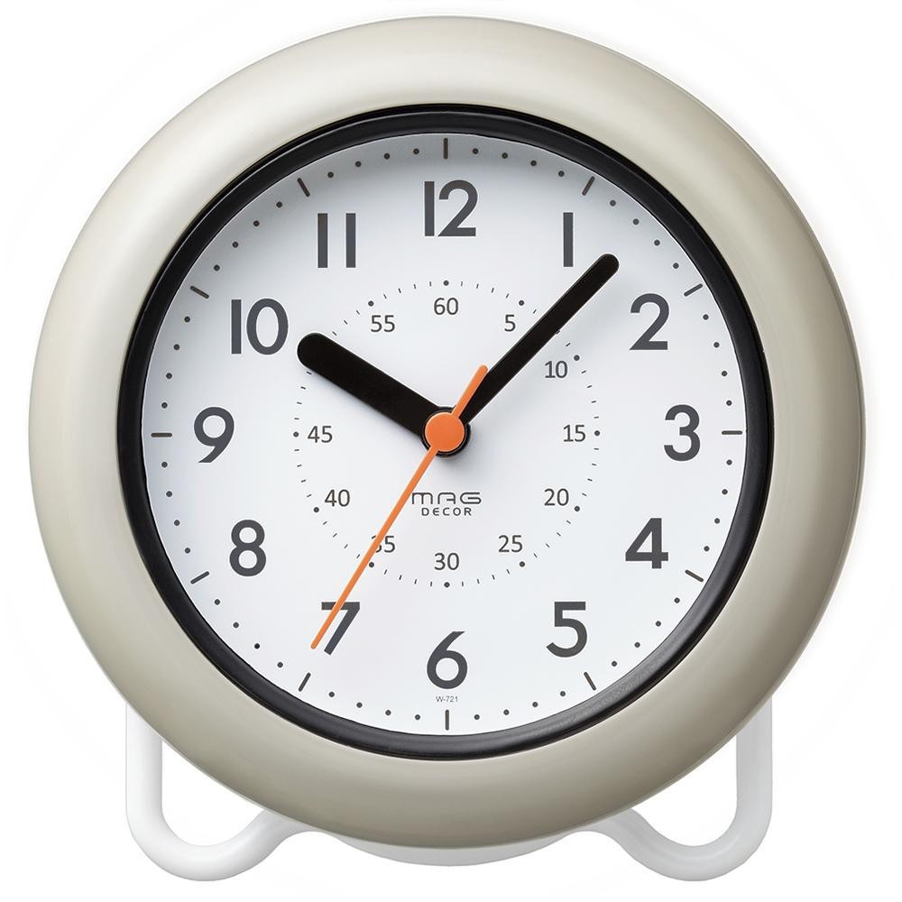 スムーズに動く秒針。水回りでも使用できる防滴仕様です。設置場所に困らないタオルハンガー兼スタンド付き。 生産国:中国 ※サプライヤー直送品 ご注文後3~4営業日後の出荷となります【商品名】MAG(マグ) 防滴バスクロック W-721 GY