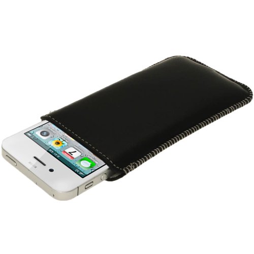 iGadgitz Black Genuine Leather Pouch Case Cover with Elasticated Pull Tab Release System for Apple iPhone SE, 5S, 5, 5C