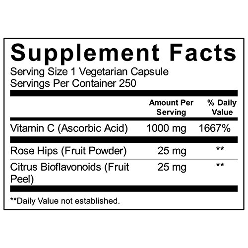 -. Feature : Non-GMO Ingredients - Beware of impurities found in other vitamin C products. Our vitamin C is third-party tested with every batch, providing natural sources of vitamin C that are guaranteed to be GMO-free. Each serving provides 1,000mg. / Synergistic Formula - Citrus bioflavonoids and rose hips enhance the bioavailability of vitamin C by offering superior absorption and efficacy. Studies have shown that these compounds increased the absorption rate of vitamin C by 35%. / Natural Skin Wonder - Vitamin C is a natural precursor to proline and lysine, two amino acids that are essential for collagen formation. Collagen provides structure and support to organs, helping to maintain the appearance of firmer and more youthful looking skin. / Provides Cellular Protection- Although known as an immunity booster, vitamin C also helps to absorb iron, neutralize free radicals, promote cardiovascular health and support healthy vision. / Easy to Swallow - Our vegetarian capsules are easy to swallow and gentle on the stomach, eliminating the discomfort commonly associated with large tablet forms of vitamin C.