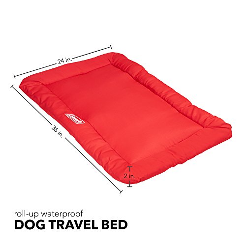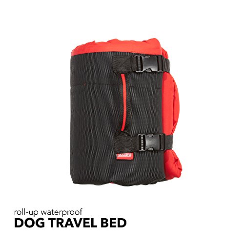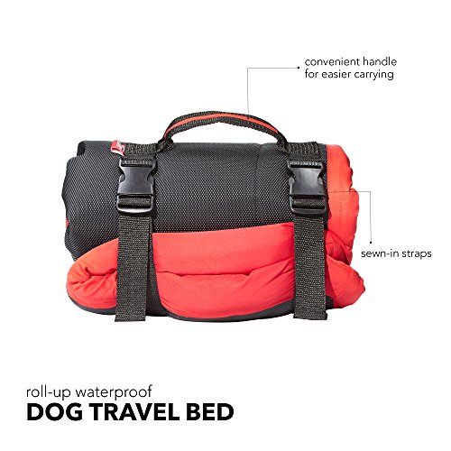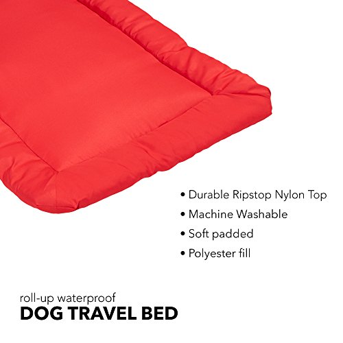 Soft padded travel bed for use outdoors, in a crate or back of a wagon or SUV. Durable waterproof ripstop nylon top and waterproof non-skid bottom. Polyester fill and machine washable. Easily rolls up for travel with sewn-in handle and straps.Feature