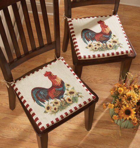 -. Feature : Set of 2 Chair Cushions / Rooster and Sunflower Decor / Non-skid backing / Machine washable / 15 inches square