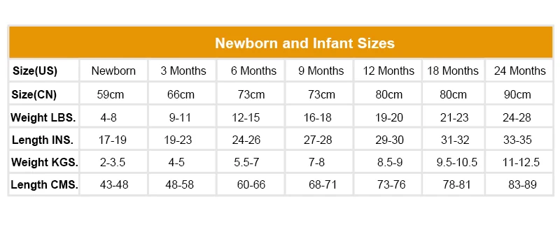 Size:Newborn=59, 3M=66, 6M=73, 12M=80, 24M=90