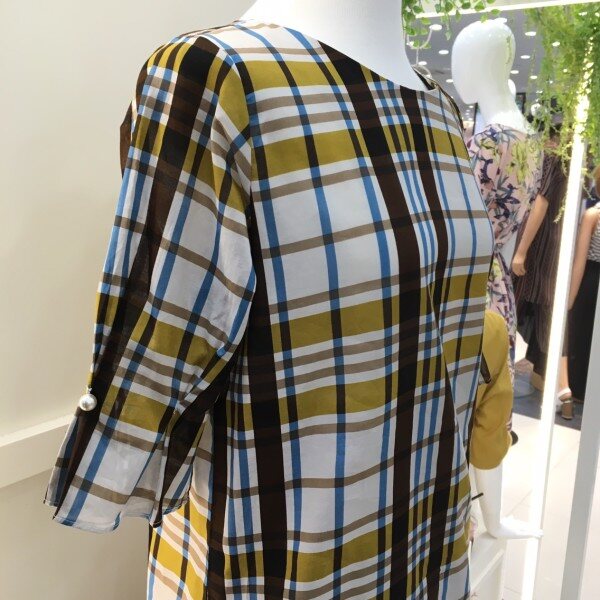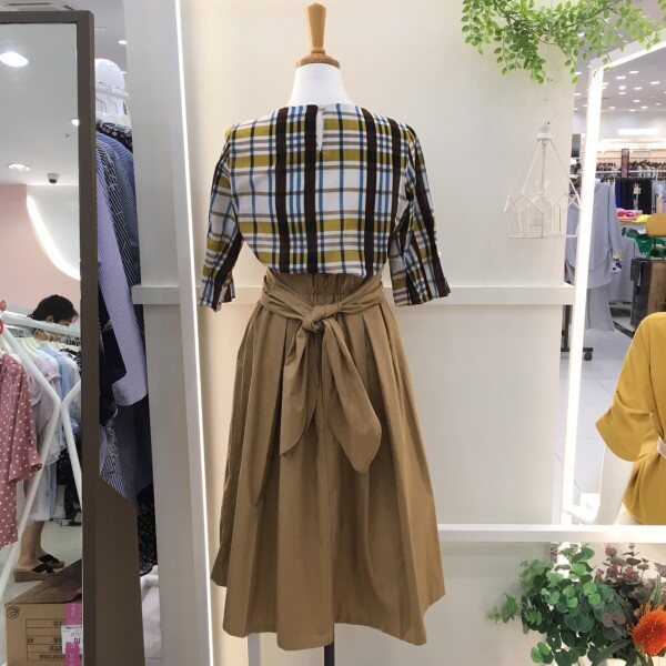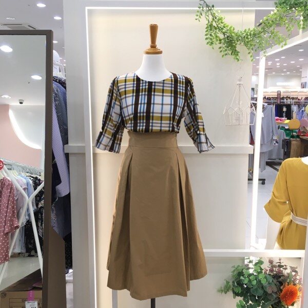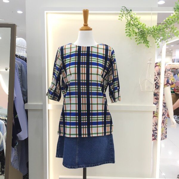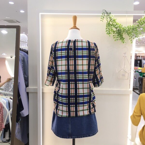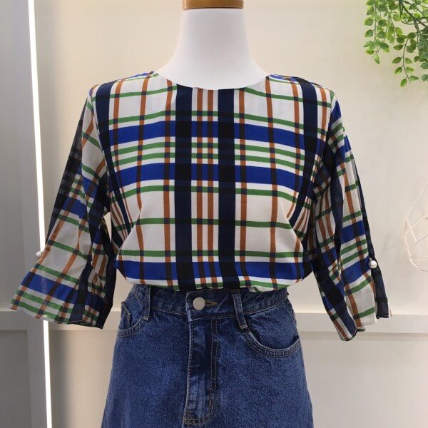 진한 색깔의 체크무늬 블라우스:) 사진처럼 면스커트, 청치마 모두 잘 어울리고 바지와의 조합도 좋답니다! 하늘하늘한 소재로 시원하고 소매부분 진주 장식이 포인트입니다^^