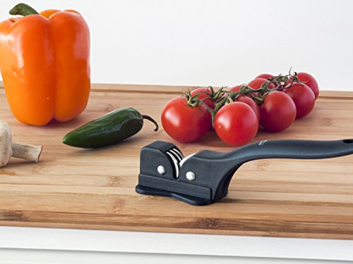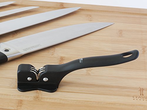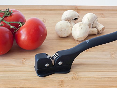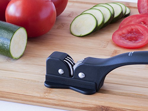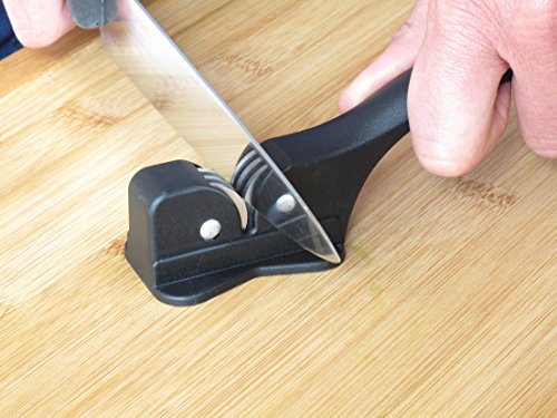 The sharper2 knife sharpener is a time-tested classic design that has been used to sharpen knives to a razor sharp edge for many years. This pull-through hand held knife sharpener, with the sharpening angle set optimally for kitchen knives, has been proven to be highly effective. With its 4-1/2 inch handle, the knife sharpener is safe, stable and very easy to use.